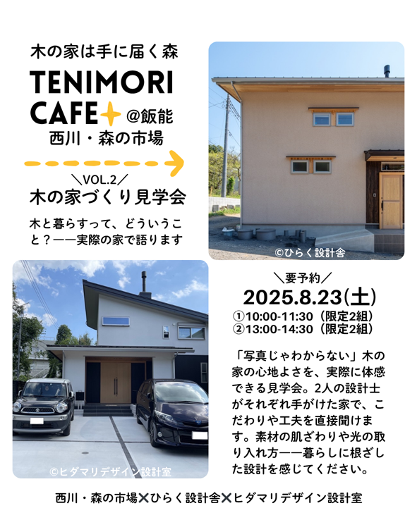 | イベント名 | 【てにもりカフェ8月「木の家づくり見学会」vol.2】木と暮らすって、どういうこと?①② |